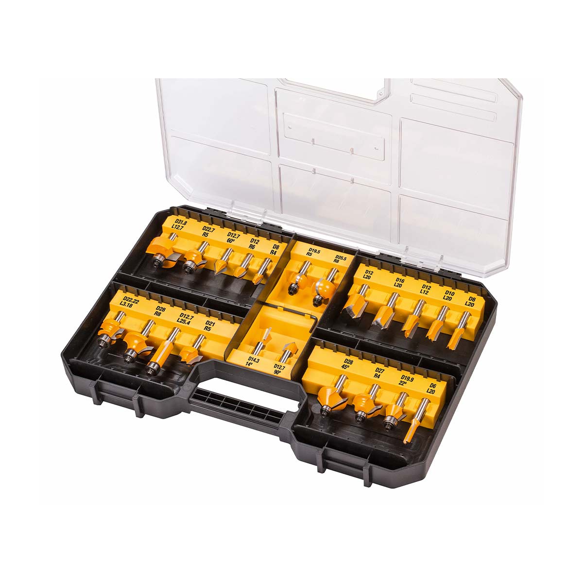 Das 22-teilige Fräser-Set DT90017-QZ von DeWalt eignet sich für Holz. Das Anti-Kickback-Design mit dem speziell geformten Korpus sorgt für ein rückschlag-freies Arbeiten in allen Holzmaterialien. Die hochwertigen Hartmetallschneiden mit winkelgenauestem Anschliff eignen sich für den härtesten Einsatz, bei maximaler Lebensdauer. Für eine noch höhere Lebensdauer der einzelnen Fräser sind die Kugellager austauschbar.