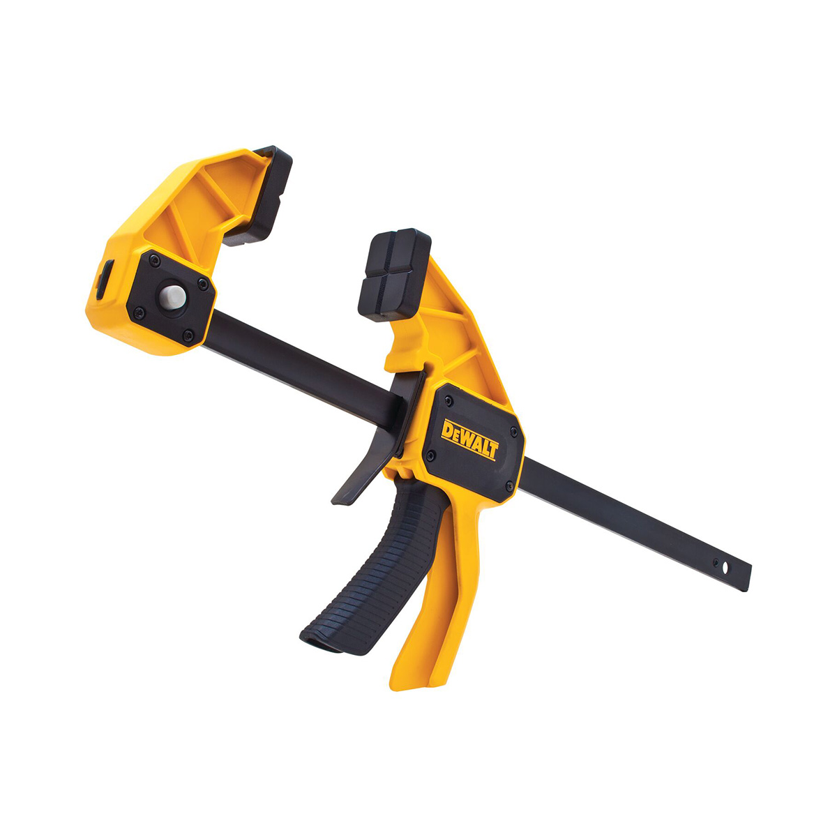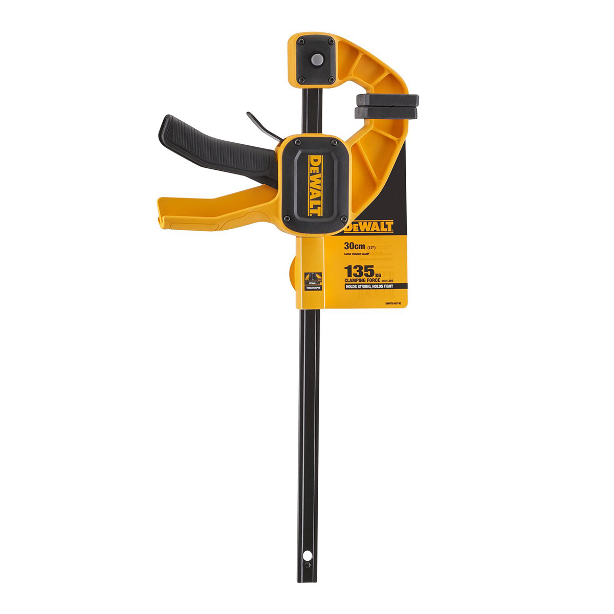 The DEWALT® 300mm Large Trigger Clamp is versatile and easy to use. Its reinforced nylon body and heat-treated steel bar are strong and durable. With 135kg of clamping force, 82mm throat depth, quick change button for easy conversion to a spreader and removable jaw pads to help reduce marring, this clamp was built to exceed the expectations of professional contractors.