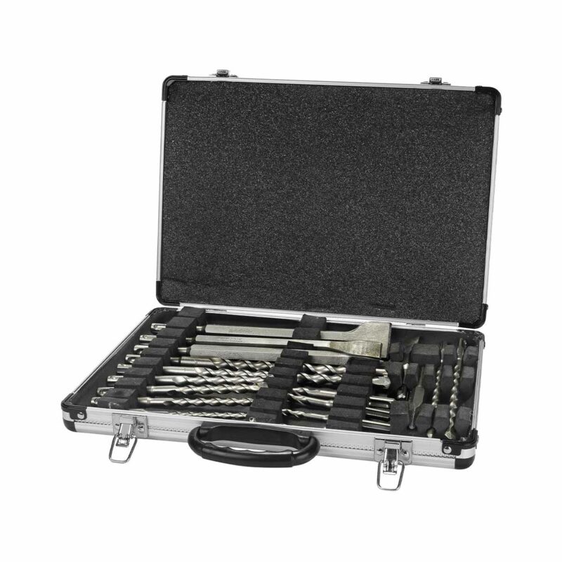 SDS-PLUS Bohrer und Meißel Set für die Arbeit mit Beton. Die Gesamtlänge der Bohrer beträgt ist 110-260 mm mit einem Durchmesser von 5-14 mm. Die Länge der Bohrspitzen und Meißel beträgt 250 mm. Der Flachmeißel hat einen Durchmesser von 20 mm und 1 Breitmeißel mit 40 mm. Im Lieferumfang enthalten sind 12 Bohrern, 2 Vollmeißeln, 2 Flachmeißel und 1 Breitmeißel mit einem Aluminiumkoffer.