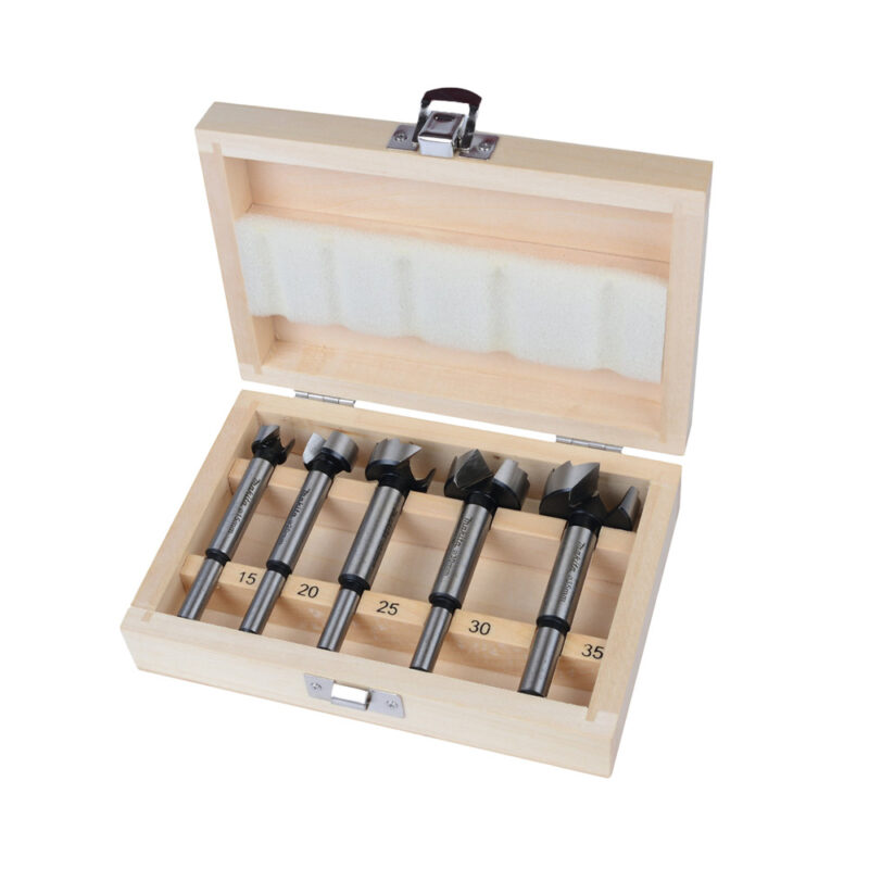 Fünf verschieden große Forstnerbohrer zum Bohren in Holz. Hergestellt aus Werkzeugstahl. Aufbewahrung in Box. Durchmesser 15, 20, 25, 30 und 35 mm.