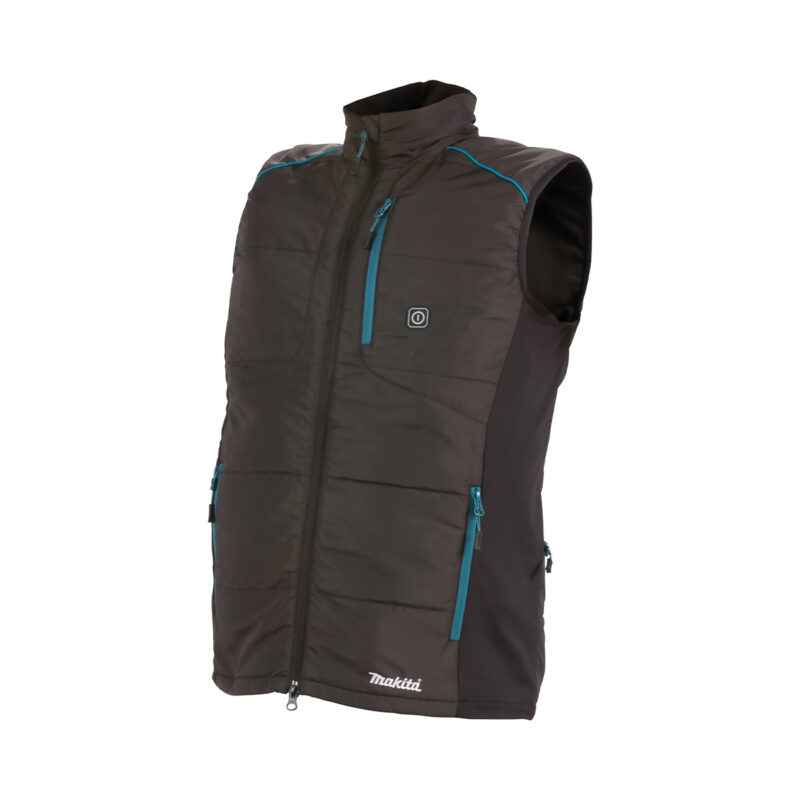 Akku-Heizgilet für 18 V Akkus und raue Bedingungen. Heizelemente an Brust, Rücken und Nacken, Drei Heizstufen mit einer Laufzeit von bis zu 36 Stunden mit einem 6,0 Ah Akku. Vier Taschen mit Zipp und das dünne Material erlauben das Tragen unter der Arbeitskleidung.