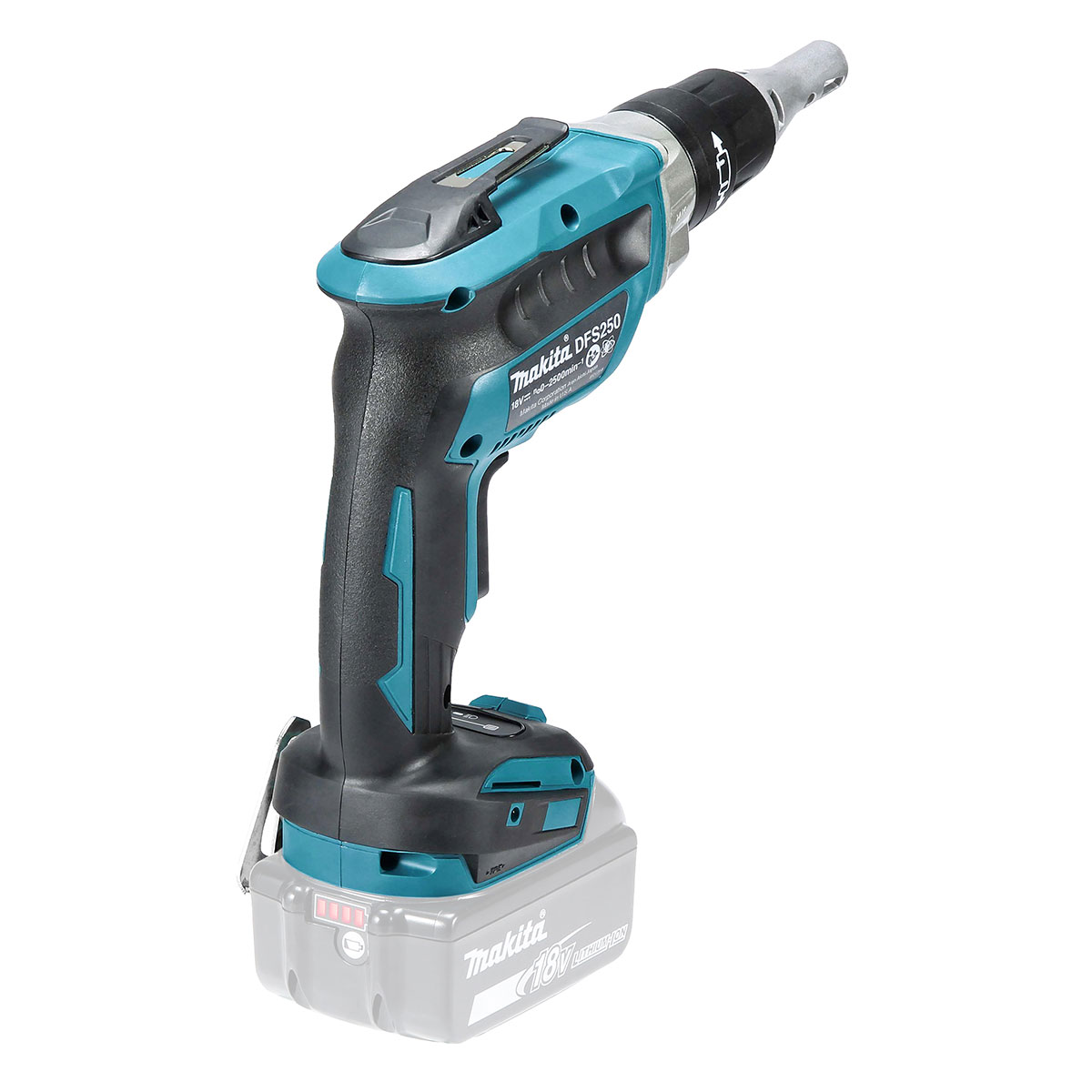 Der DFS250 verfügt über einen One-Touch-Bit-Locator und eine geräuscharme Kupplung, die den Antrieb abschaltet, wenn die Schraube zu Hause ist. Es wird 5 mm Trockenbauschrauben so weit wie möglich einschlagen, 6 mm selbstbohrende Schrauben und 90 mm x 4,5 Grobgewindebefestigungen.