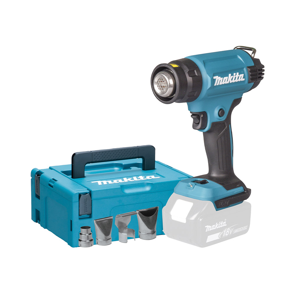 Erreicht mit einem LXT-Akku bis zu 21 Minuten Betriebszeit. Ideal für eine Vielzahl von Anwendungen wie z.B. Entlacken. Das Heißluftgebläse erreicht eine Temperatur von bis zu 550°C und hat eine maximale Luftdurchflussmenge von 200l/min. Düsen können leicht gewechselt werden und das Model ist kompatibel mit diversen Zubehörteilen.LED-Licht zur Beleuchtung des Arbeitsbereichs