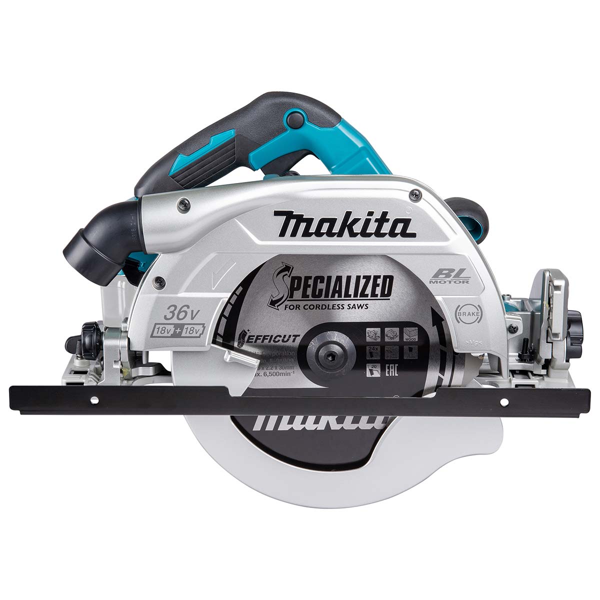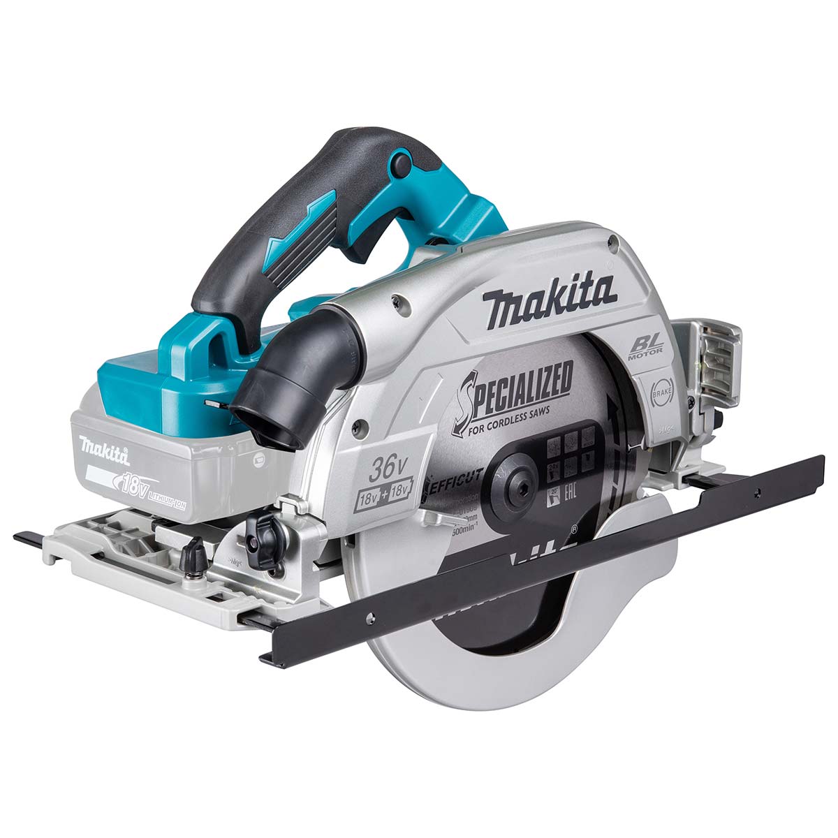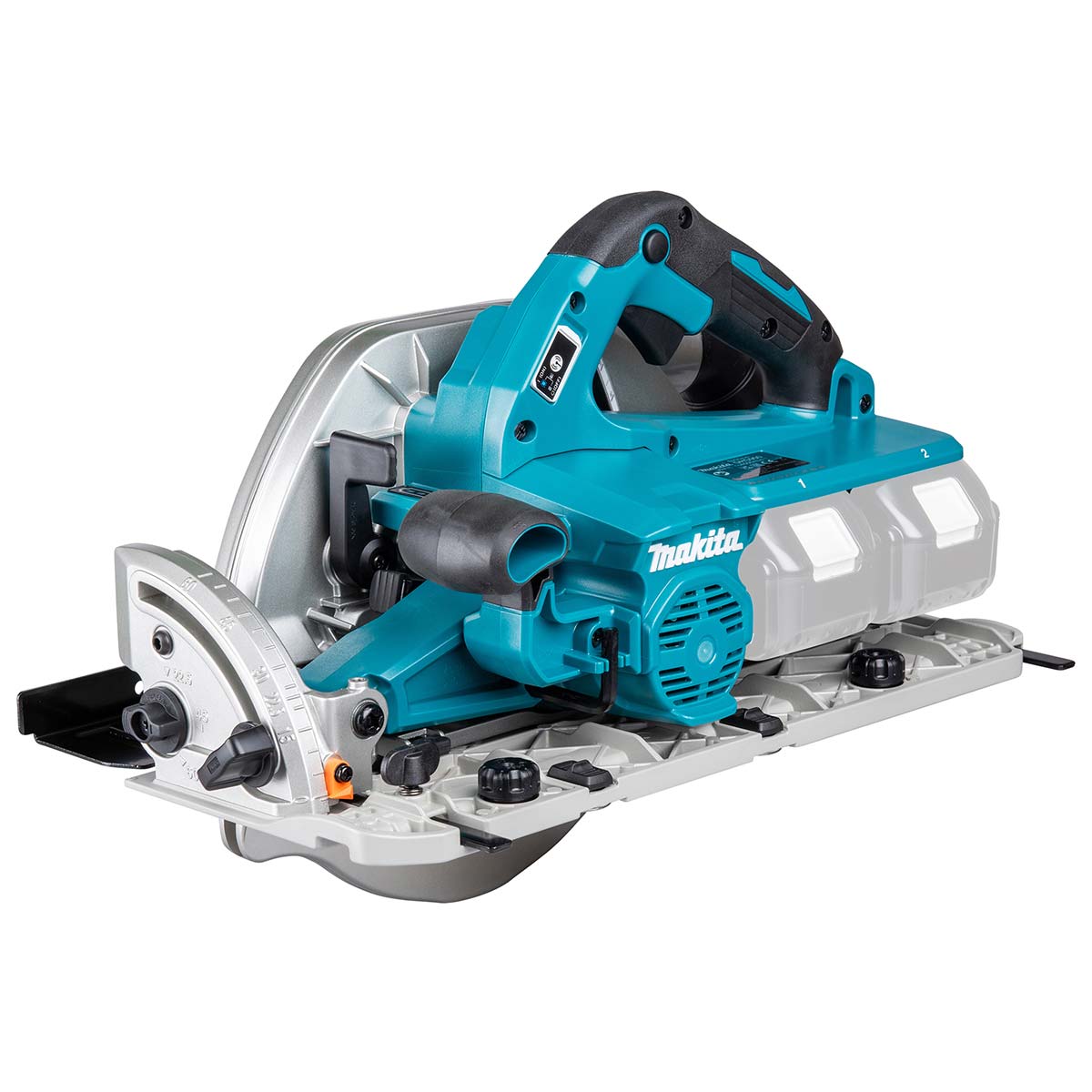 Hocheffiziente Akku-Handkreissäge für den anspruchsvollen Einsatz. Bürstenloser 36V-Motor läuft mit zwei 18V-Akkus. Sägeblattdrehzahl 4.500 U/min . Der Magnesium-Sägetisch kann direkt an der Führungsschiene befestigt werden. Mit AWS-Technologie für automatisches Einschalten der Staubabsaugung.