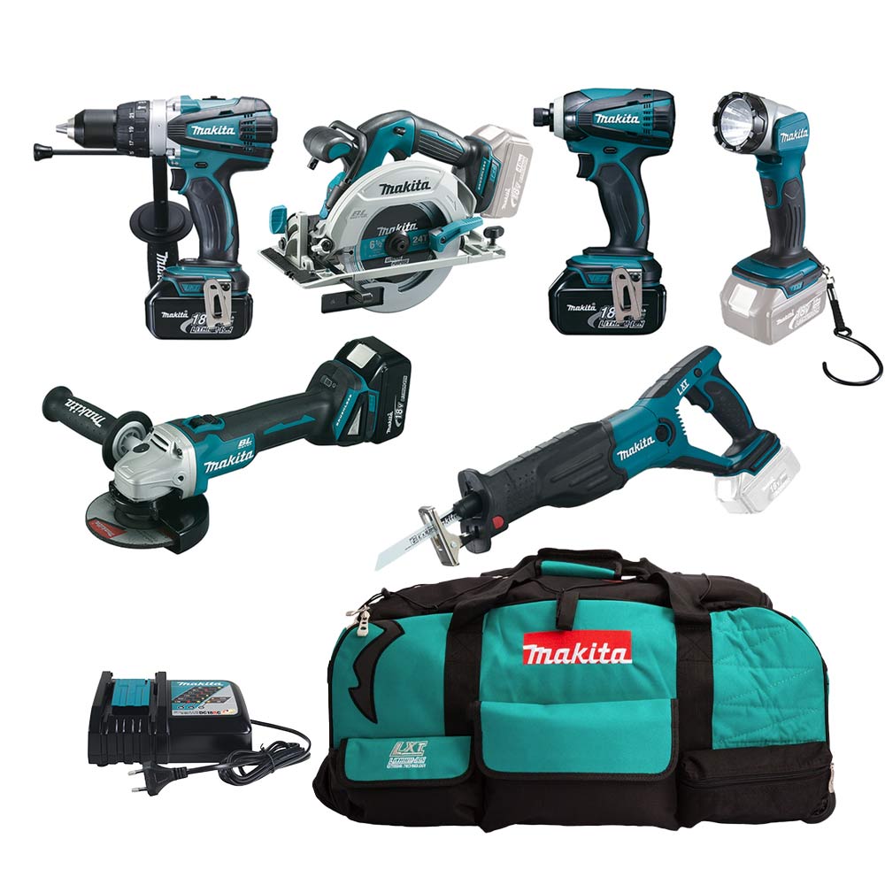 Ein umfangreiches Set mit kabellosen 18V LXT-Werkzeugen und einer Lampe für den Profibetrieb. Enthält die Kombi-Bohrmaschine DHP458, den Winkelschleifer DGA504, die Kreissäge DHS680, die Reciprosäge DJR181, den Schlagschrauber DTD146, die Lampe DEADML802, 2 Stück 5,0 Ah Akkus und ein Schnellladegerät. Dazu gehört auch eine Tasche für die Aufbewahrung und den Transport der Werkzeuge.