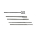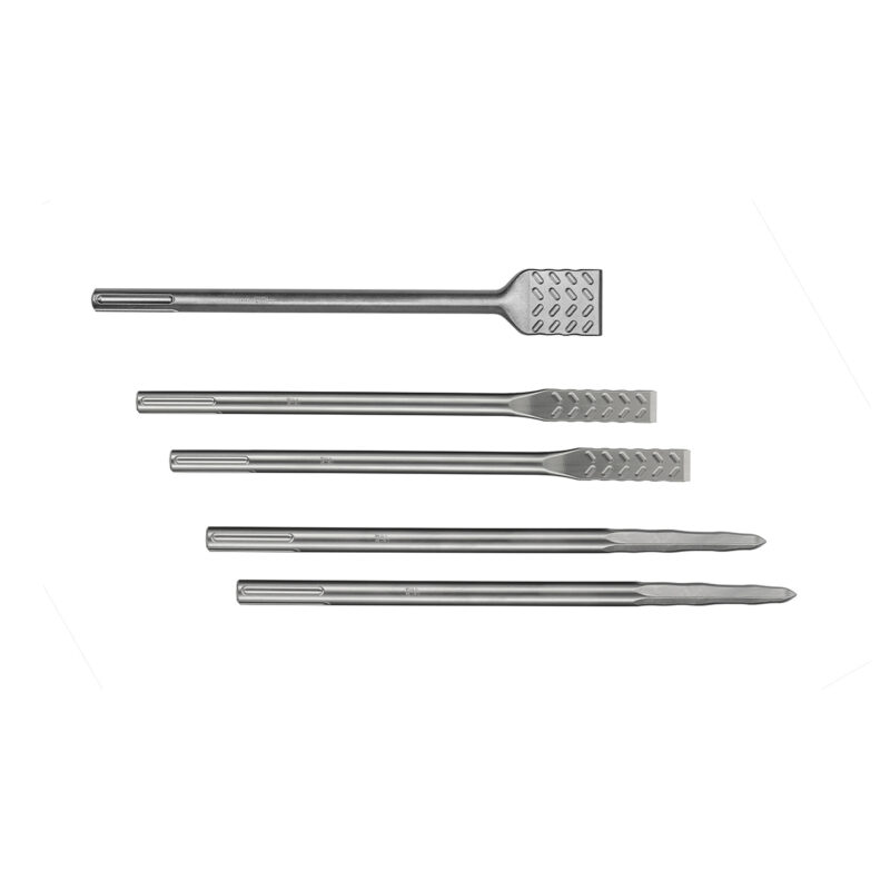 SDS-MAX Meißelset für die Arbeit mit Beton. Die Gesamtlänge beträgt 380-400 mm. Der Flachmeißelist 25 mm und Skalierung Der Flachmeißel ist 50 mm. Im Lieferumfang entalten sind 2 Spitzmeißeln, 2 Meißeln und einem Breitmeißel
