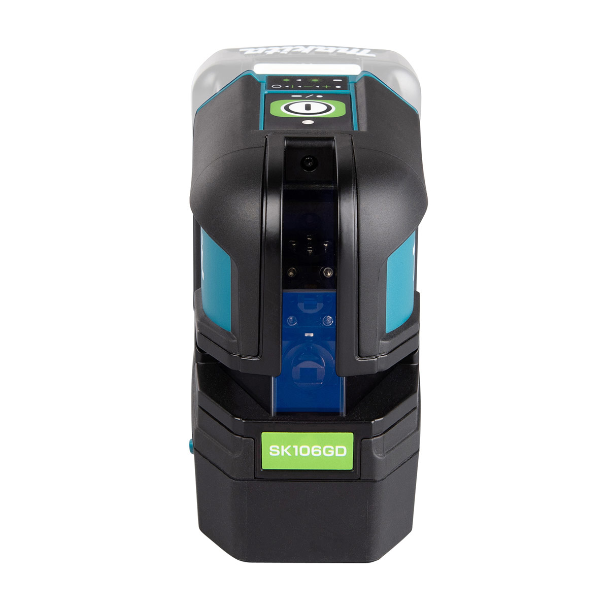 Selbstnivellierender Kreuzlinien-Nivellier Laser mit grünem vertikalen und horizontalen Linien, die getrennt oder zusammen verwendet werden können. Der Punkt lasert oben, unten, links, rechts. Sichtweite 35 Meter. Alle Funktionen können über einen zentralen Schalter bedient werden. Der Laser ist staub- und spritzwassergeschützt nach IP54, seine Laufzeit mit einer 4,0 Ah Akkuladung beträgt etwa 20 h.