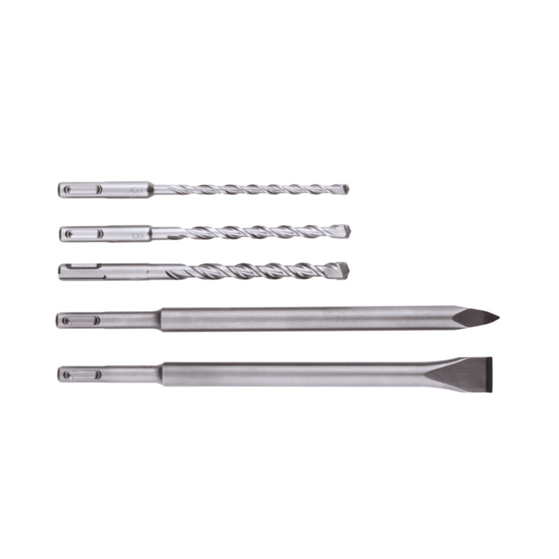 je 1 Hammerbohrer Ø 6x160mm, 8x160mm, 10x160mm, 1 Spitzmeißel 250mm und 1 Flachmeissel 250x20mm