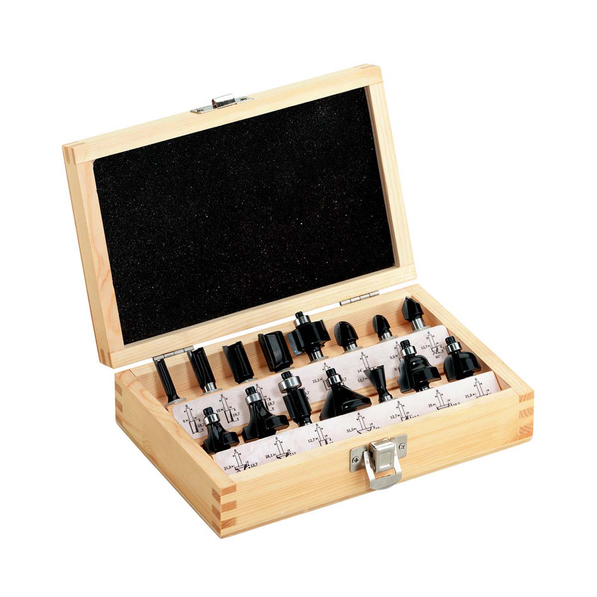 Bestehend aus: 4 x Nutfräser: 6 mm; 10 mm; 12 mm; 16 mm; 3 x Hohlkehlfräser: 12,7 mm, R 6,3mm; 9,5 mm; R 4,8 mm; 21,8 mm; R 6,3 mm; 1 x Fase/Bündigfräser: 31,5 mm; 45°; 1 x V-Nutfräser 12,7 mm; 14°; 2 x Abrundfräser: 28,1 mm; R 9,5 mm; 21,8 mm; R 6,3 mm; 1 x Bündigfräser: 12,7 mm; 1 x Zinkenfräser: 12,7 mm; 14°; 1 x Profilfräser: 25 mm; R 4,5 mm; 1 x Falzfräser: 22,2 mm