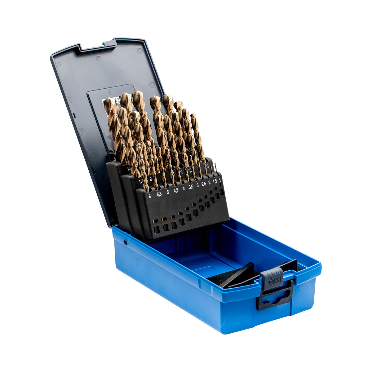 Das Set enthält 25 HSS-Spiralbohrer in der Ausführung INOX in HSSE-Co5 (M35) für industrielle Einsätze. Die bruchfeste Kunststoffbox schützt die Werkzeuge vor Schmutz und Beschädigung. Die Fixierung der HSS-Spiralbohrer erleichtert die Auswahl und Entnahme der Werkzeuge.