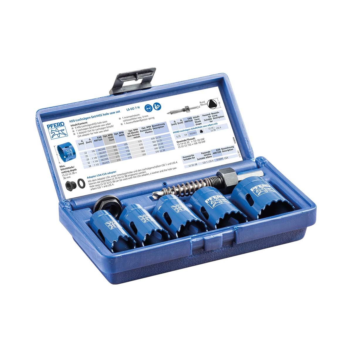 Das Set enthält fünf HSS-Lochsägen in den gebräuchlichsten Durchmessern inklusive Zubehör für das Handwerk. Es wird in einer übersichtlichen Kunststoffbox, die vor Schmutz und Beschädigung schützt, geliefert. Eine Bedienungsanleitung ist beigefügt. Der Einsatz von Lochsägen LS 32 und LS 38 ist in Verbindung mit dem Adapter LSA und Unterlegscheibe möglich.